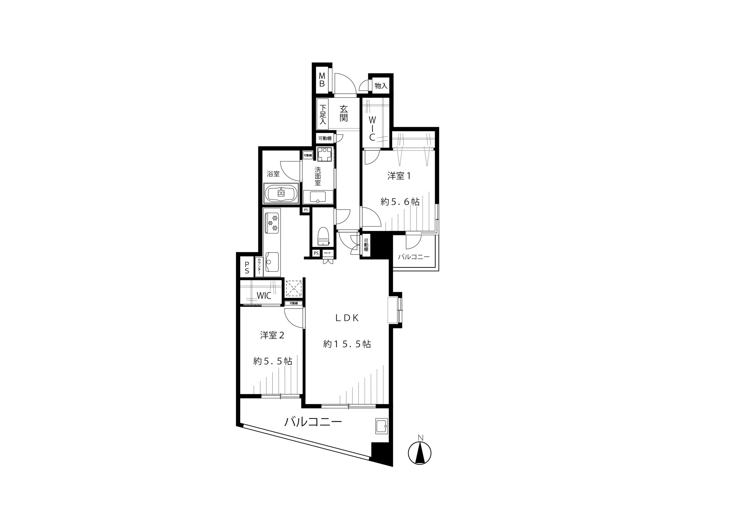- 間取り:2LDK (壁芯専有面積:68.51㎡)